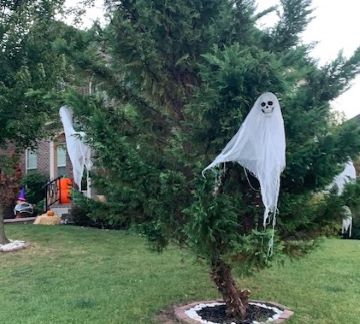 2024-09-18 ご近所のハロウィン飾り付け レキシントン生活 10月31日のハロウィーン、まだまだ先だと思っていますが近隣のショップではトリックorトリート用のお菓子も売り始まり、飾り付けもオレンジ色のハロウィーンカラーになっています。ワンコとの朝の散歩でご近所を歩いていますが、様々な飾り付けがあって面白い!!急に出現した巨大骸骨にはビックリ。夜通ったら肋骨部分が光っていました。今朝の日の出は7:23、大きな満月が朝焼けの中に出ていてとっても綺麗でした。(月の写真は撮れませんでした)